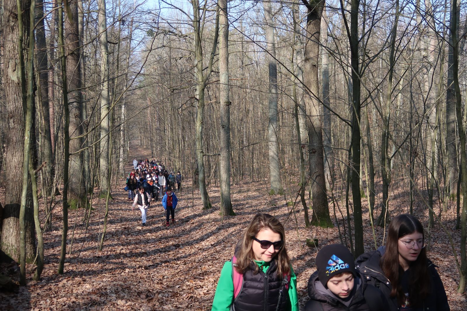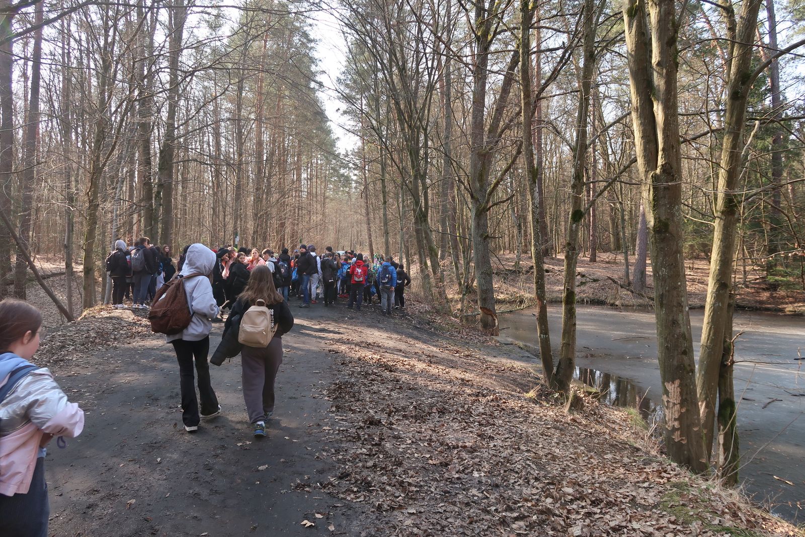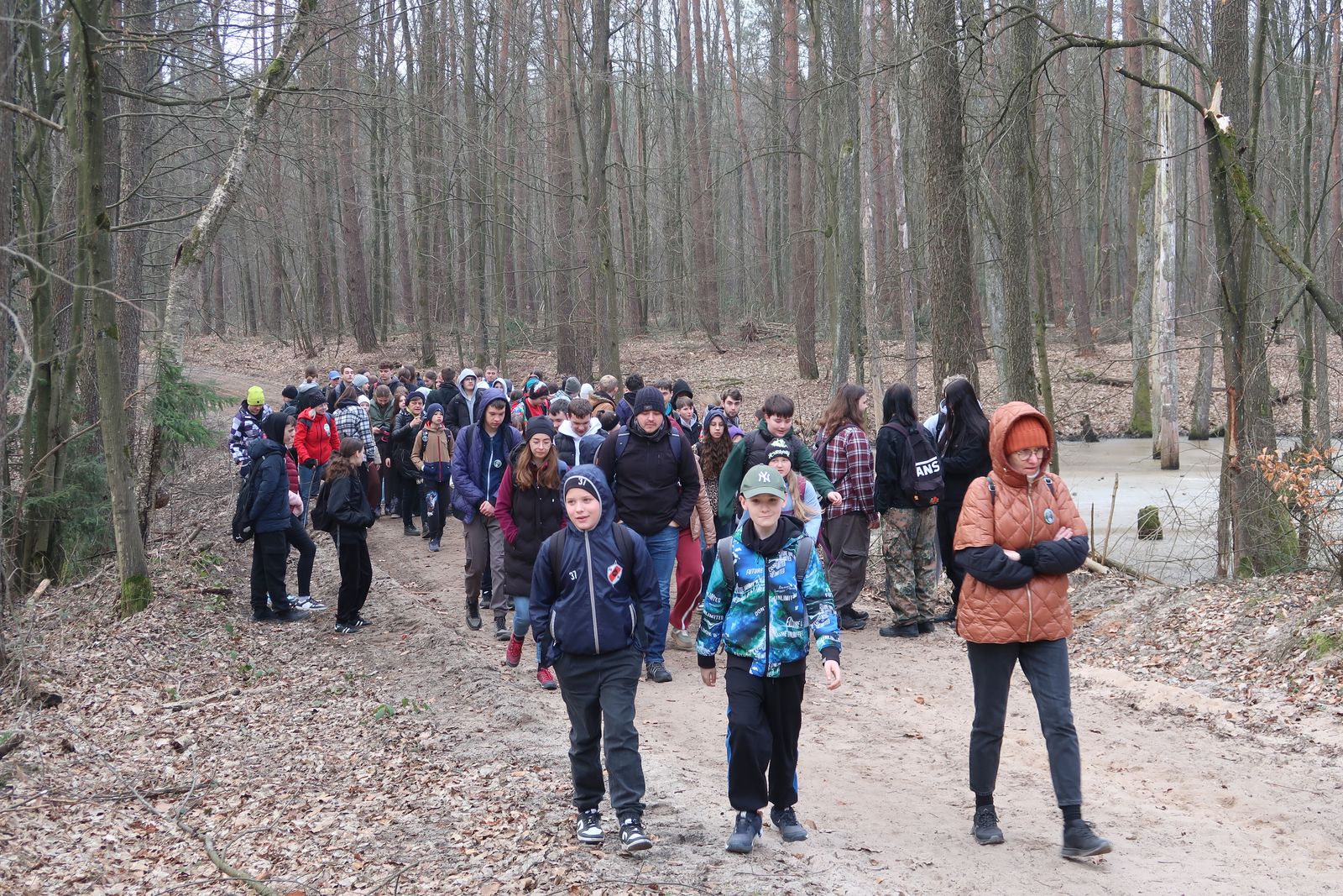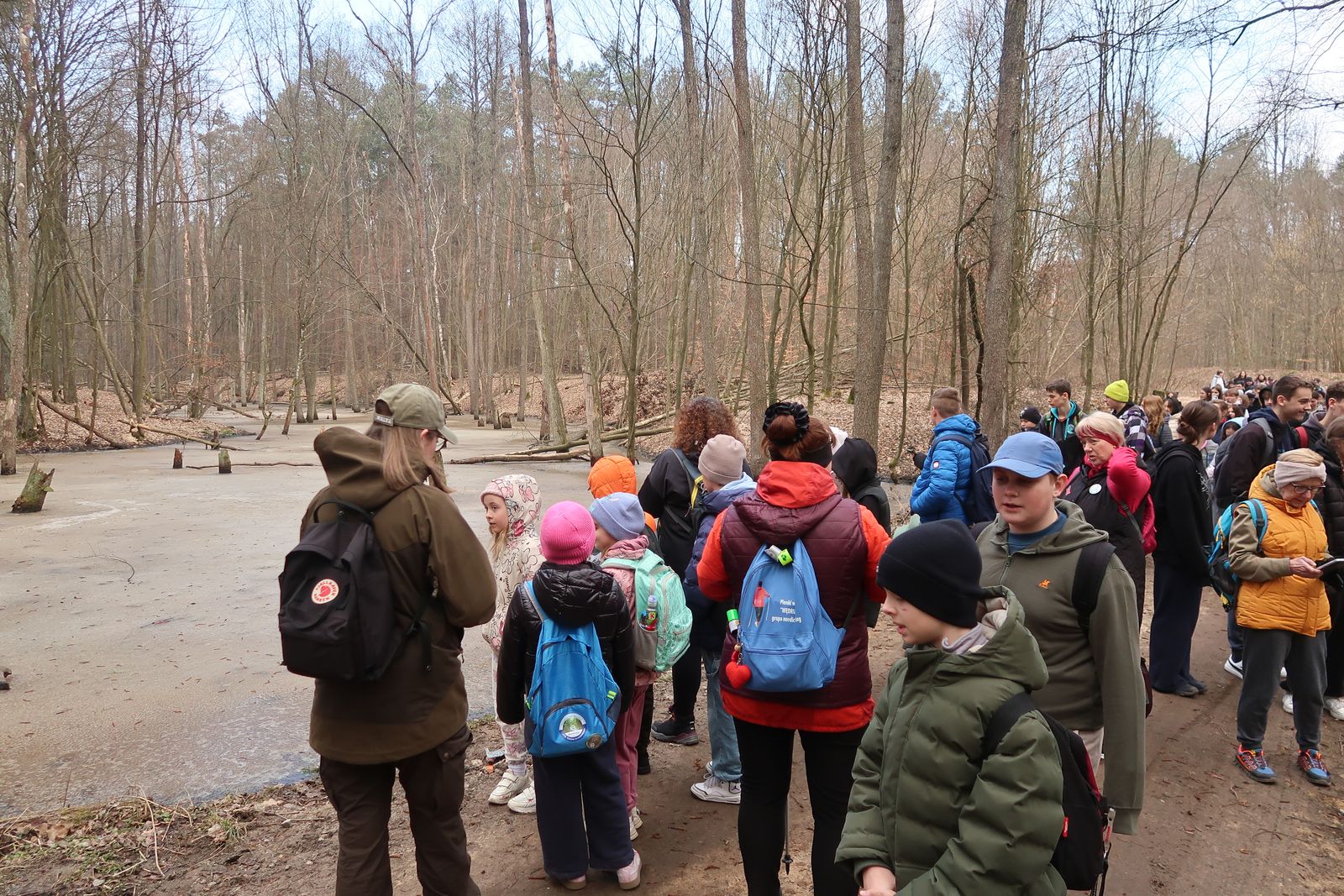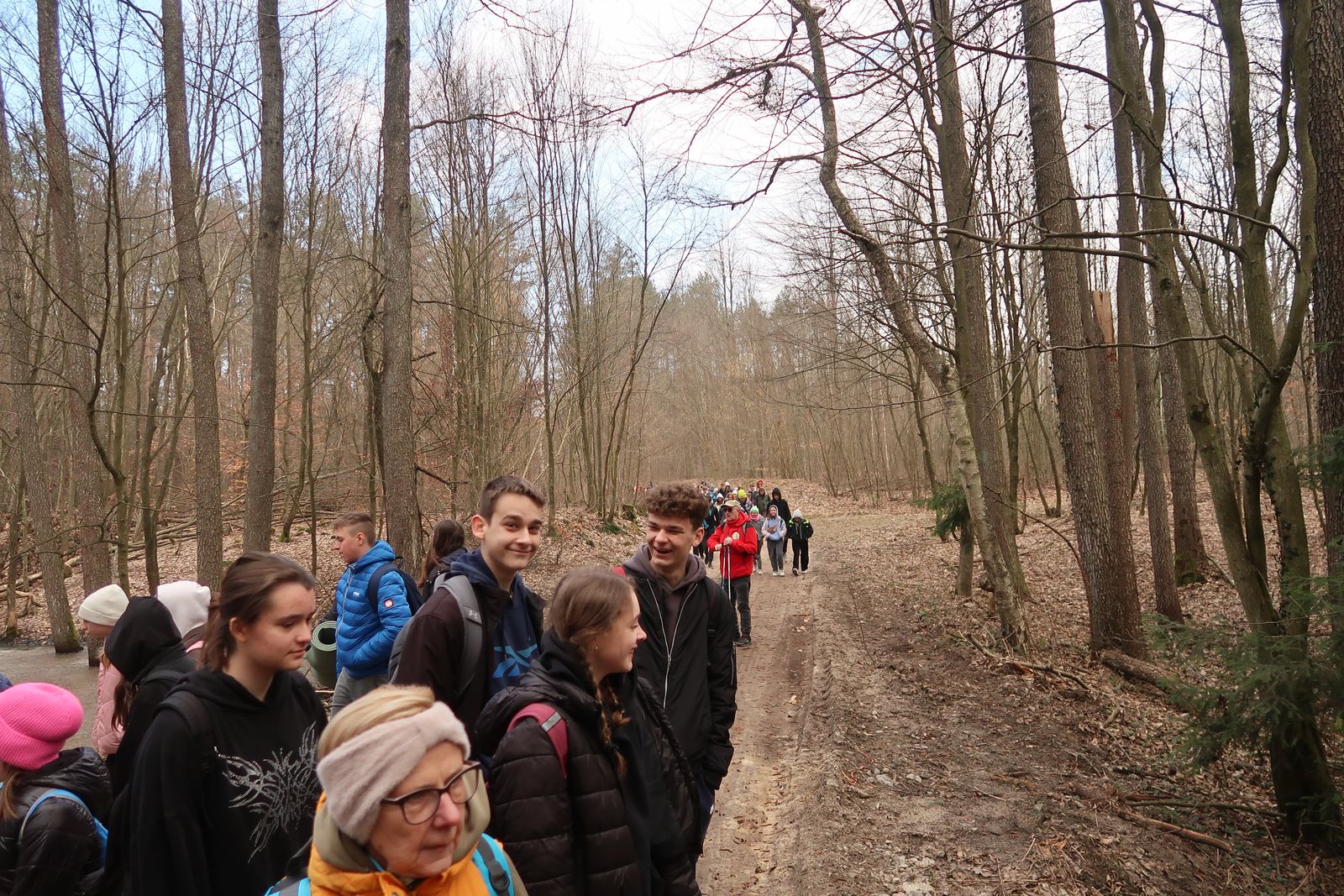 Wyruszyliśmy na trasę z Augustowa. Po przejściu kilkuset metrów dotarliśmy do urokliwej doliny Brzeźniczki. Woda na zbiorniku jeszcze nie rozmarzła - czeka na wiosnę:). Następnie, trochę na przełaj, przeszliśmy do leśnej mogiły z czasów I wojny światowej. Dalej, klucząc leśnymi duktami, dotarliśmy do rezerwatu Brzeźniczka. Tu o jego walorach opowiedział pani Karolina Bukowska z Nadleśnictwa Kozienice. Później, idąc tzw. Czarną Drogą, doszliśmy do Pionek i siedziby Nadleśnictwa Kozienice. Tam czekał na wszystkich gorący posiłek i oczywiście test krajoznawczy z nagrodami.