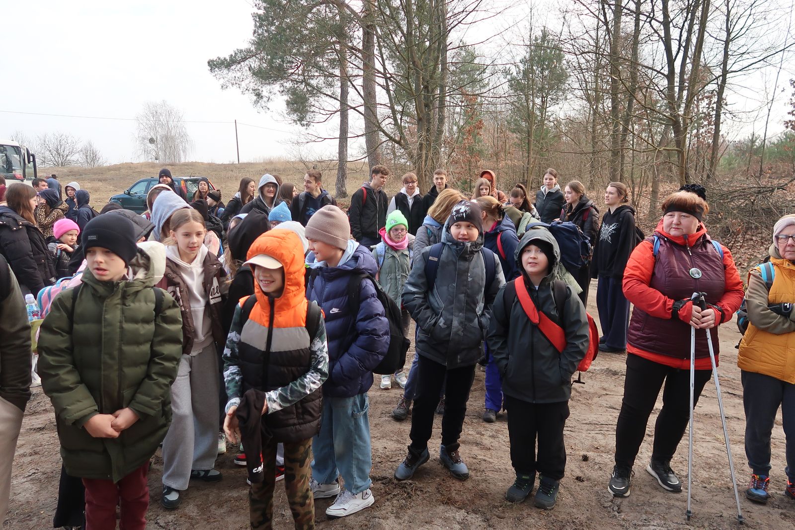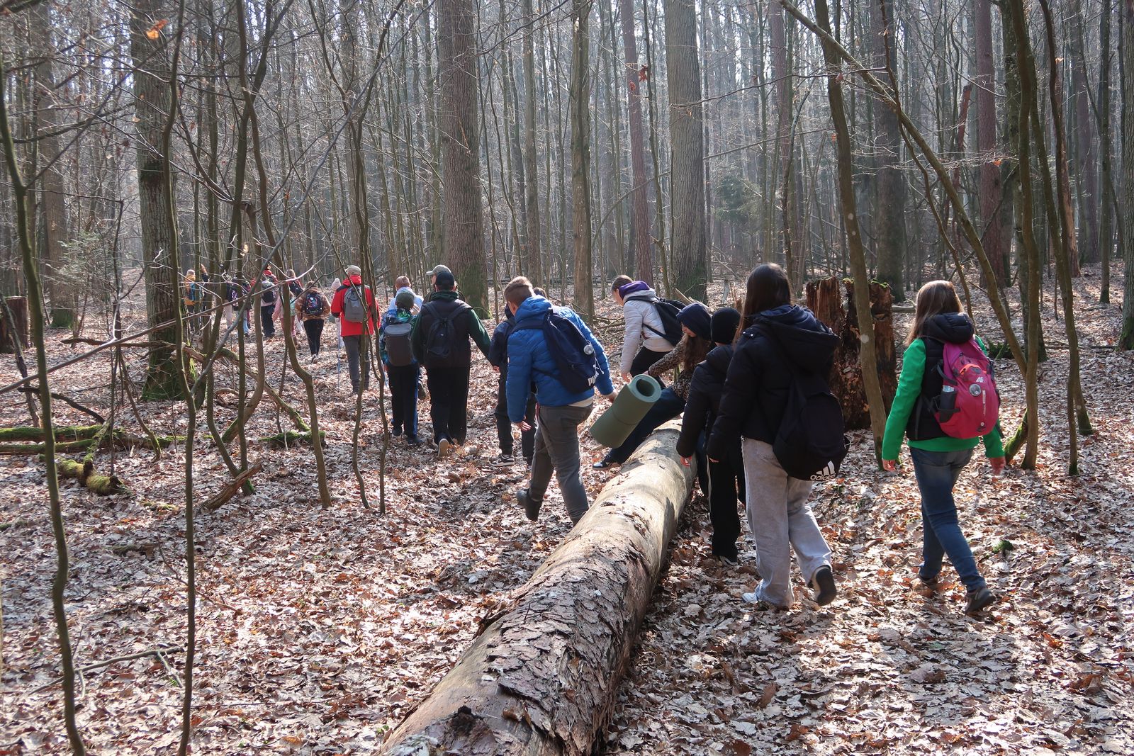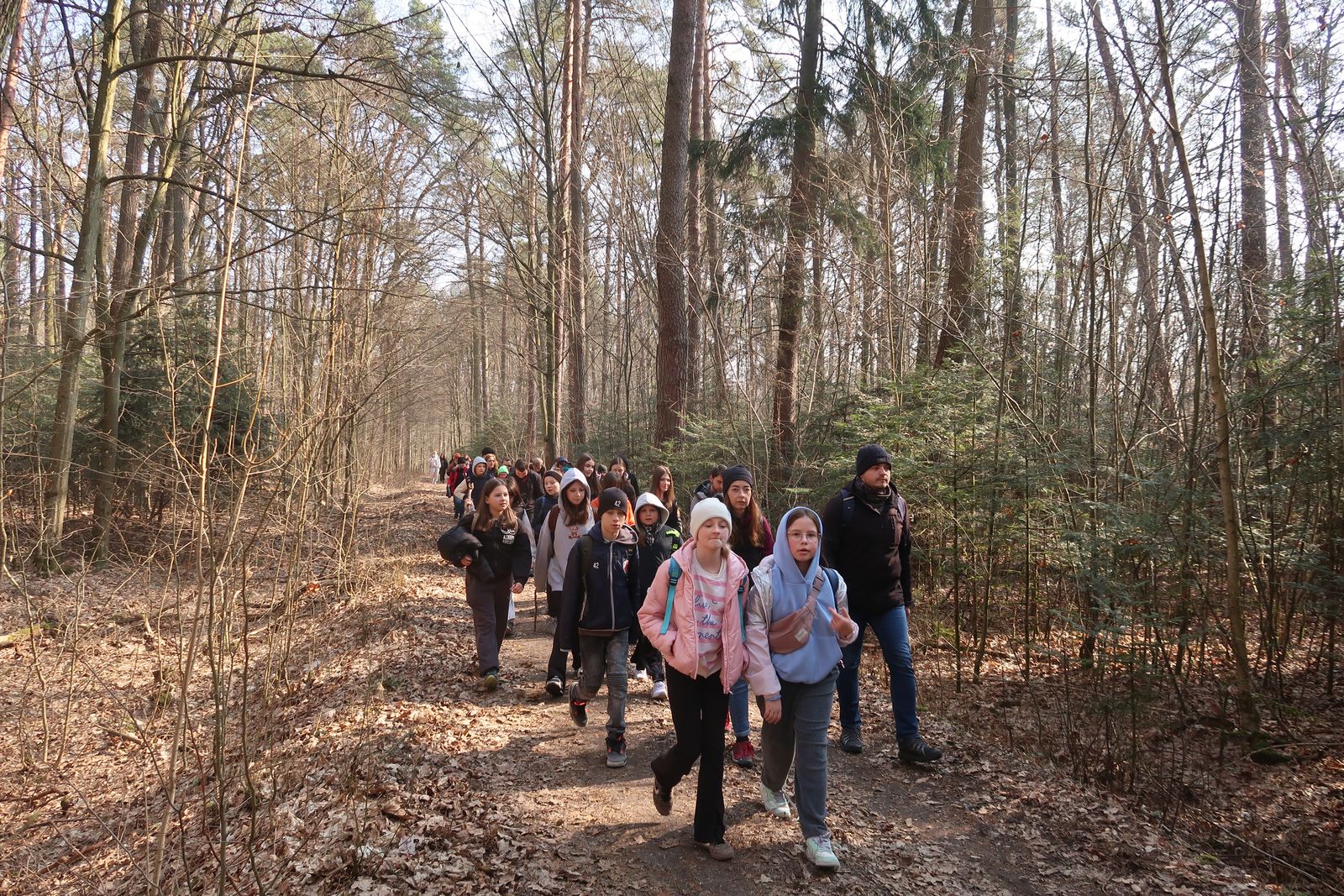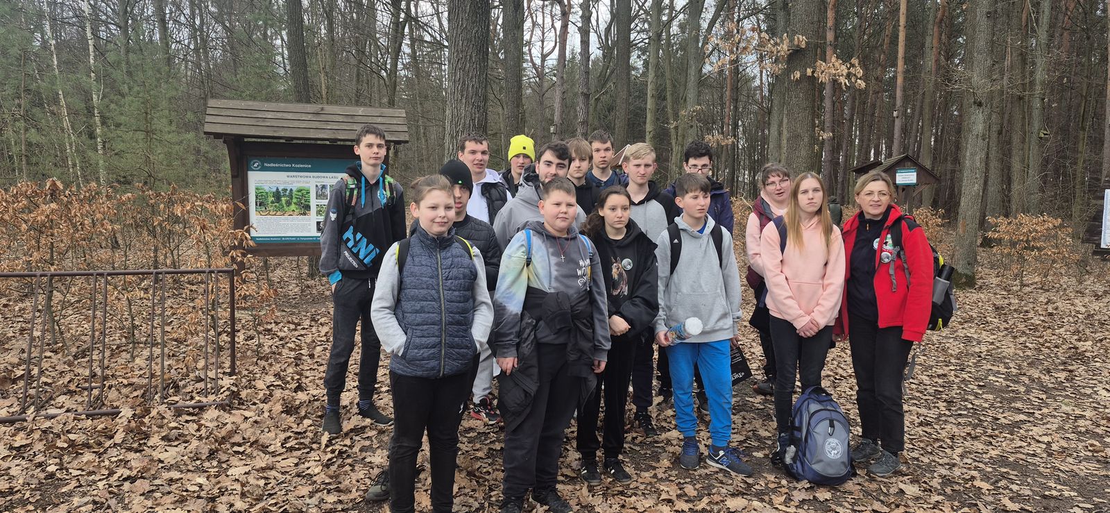 Wyruszyliśmy na trasę z Augustowa. Po przejściu kilkuset metrów dotarliśmy do urokliwej doliny Brzeźniczki. Woda na zbiorniku jeszcze nie rozmarzła - czeka na wiosnę:). Następnie, trochę na przełaj, przeszliśmy do leśnej mogiły z czasów I wojny światowej. Dalej, klucząc leśnymi duktami, dotarliśmy do rezerwatu Brzeźniczka. Tu o jego walorach opowiedział pani Karolina Bukowska z Nadleśnictwa Kozienice. Później, idąc tzw. Czarną Drogą, doszliśmy do Pionek i siedziby Nadleśnictwa Kozienice. Tam czekał na wszystkich gorący posiłek i oczywiście test krajoznawczy z nagrodami.