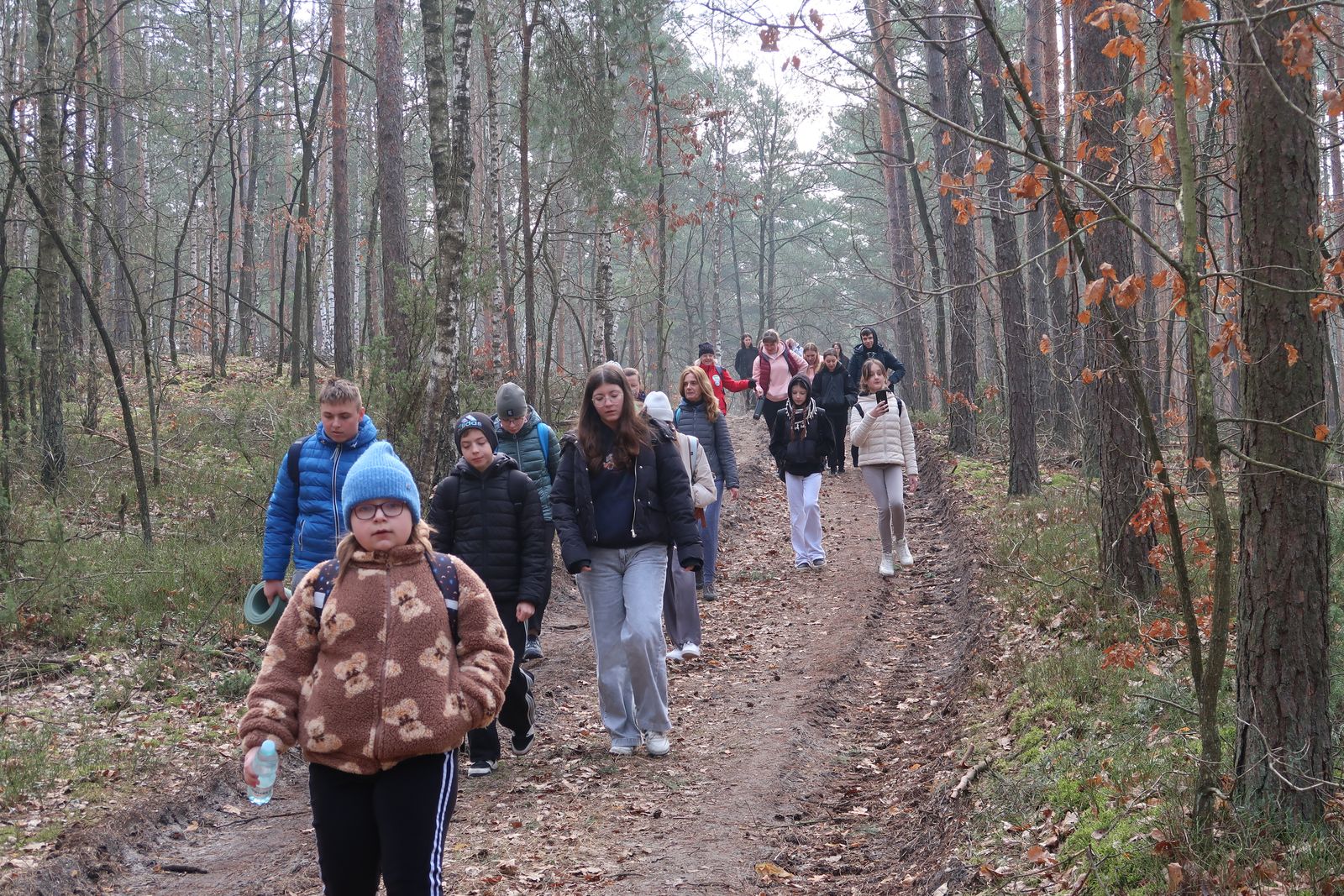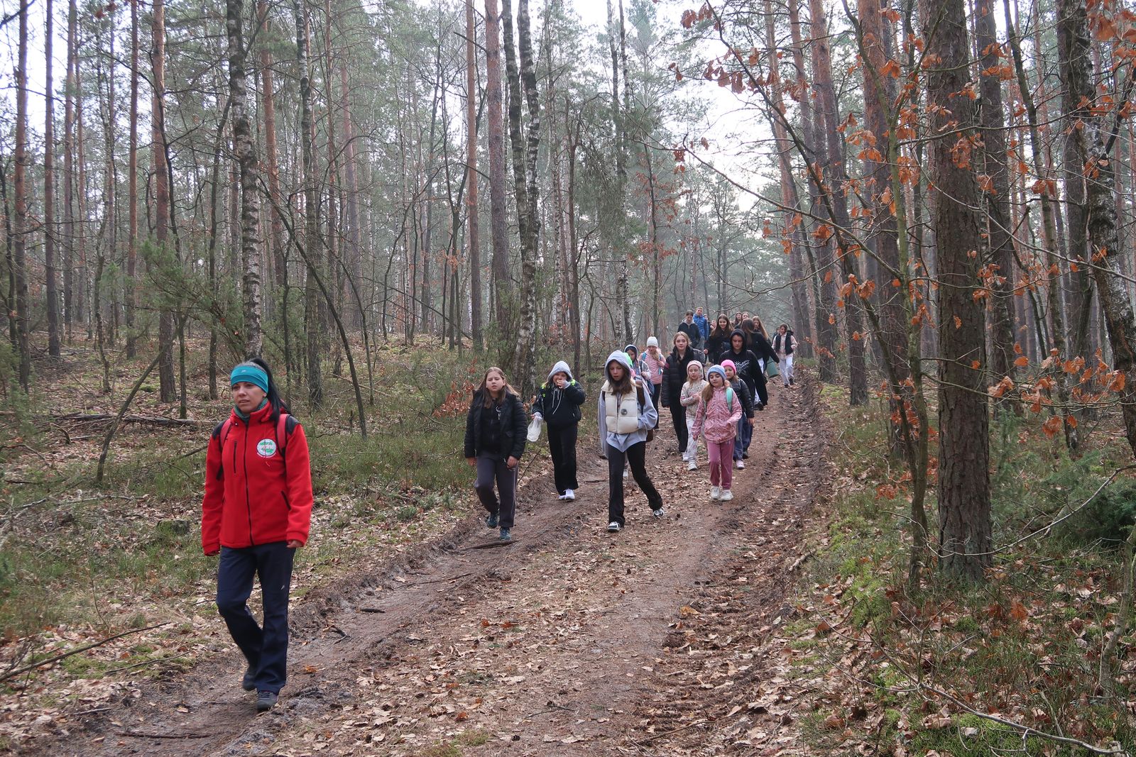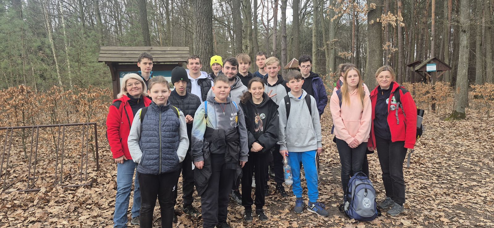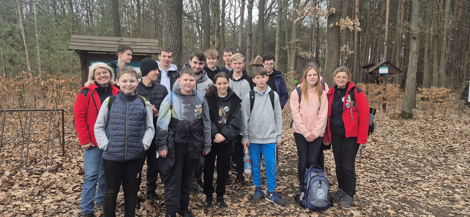 Wyruszyliśmy na trasę z Augustowa. Po przejściu kilkuset metrów dotarliśmy do urokliwej doliny Brzeźniczki. Woda na zbiorniku jeszcze nie rozmarzła - czeka na wiosnę:). Następnie, trochę na przełaj, przeszliśmy do leśnej mogiły z czasów I wojny światowej. Dalej, klucząc leśnymi duktami, dotarliśmy do rezerwatu Brzeźniczka. Tu o jego walorach opowiedział pani Karolina Bukowska z Nadleśnictwa Kozienice. Później, idąc tzw. Czarną Drogą, doszliśmy do Pionek i siedziby Nadleśnictwa Kozienice. Tam czekał na wszystkich gorący posiłek i oczywiście test krajoznawczy z nagrodami.