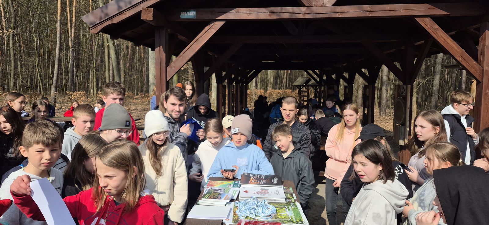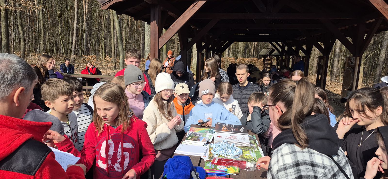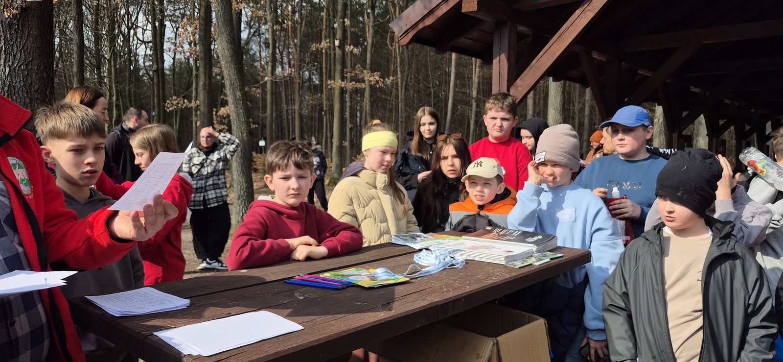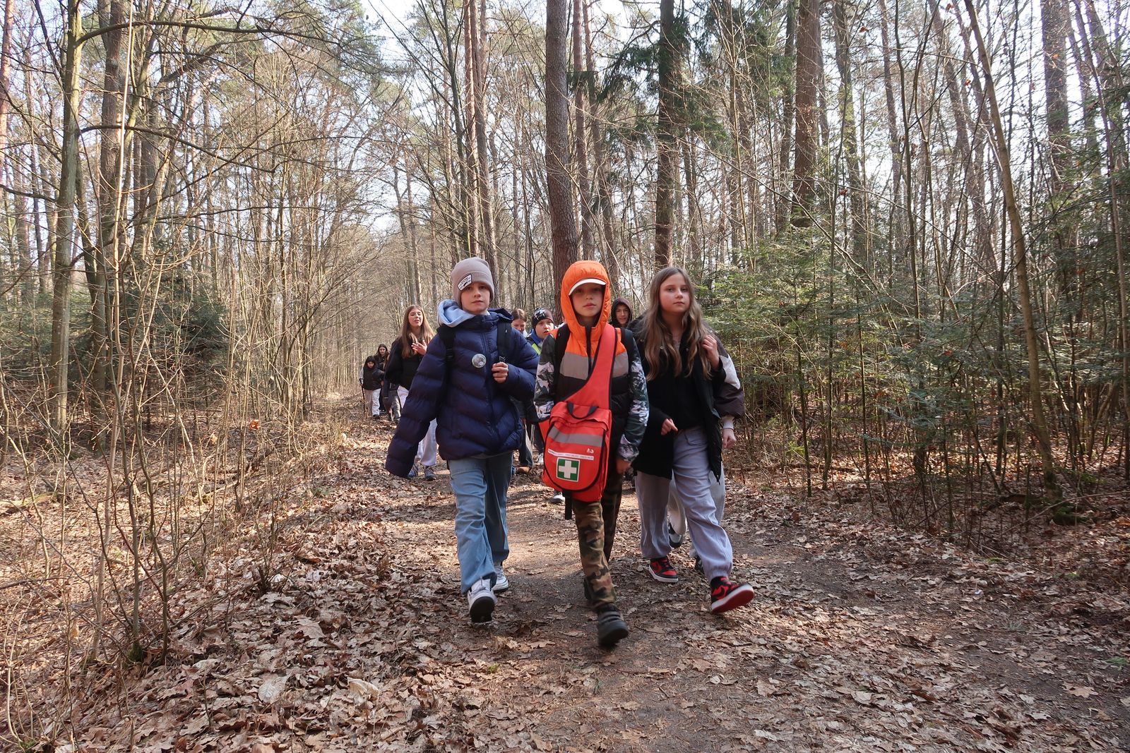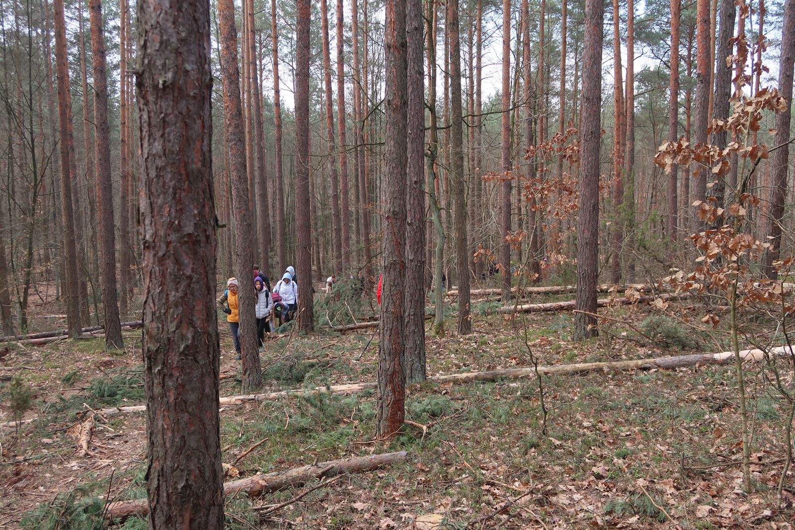 Wyruszyliśmy na trasę z Augustowa. Po przejściu kilkuset metrów dotarliśmy do urokliwej doliny Brzeźniczki. Woda na zbiorniku jeszcze nie rozmarzła - czeka na wiosnę:). Następnie, trochę na przełaj, przeszliśmy do leśnej mogiły z czasów I wojny światowej. Dalej, klucząc leśnymi duktami, dotarliśmy do rezerwatu Brzeźniczka. Tu o jego walorach opowiedział pani Karolina Bukowska z Nadleśnictwa Kozienice. Później, idąc tzw. Czarną Drogą, doszliśmy do Pionek i siedziby Nadleśnictwa Kozienice. Tam czekał na wszystkich gorący posiłek i oczywiście test krajoznawczy z nagrodami.