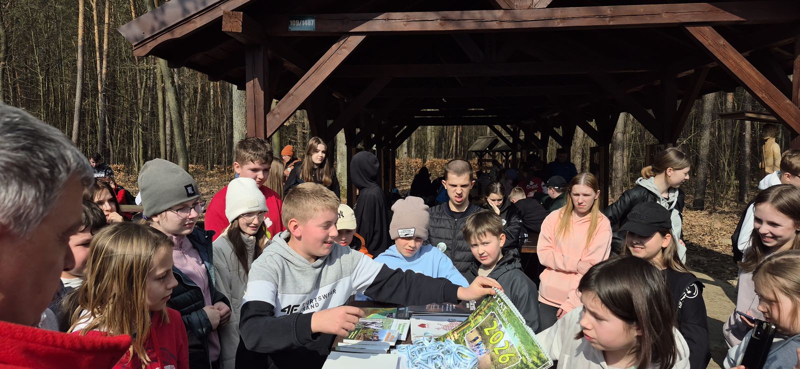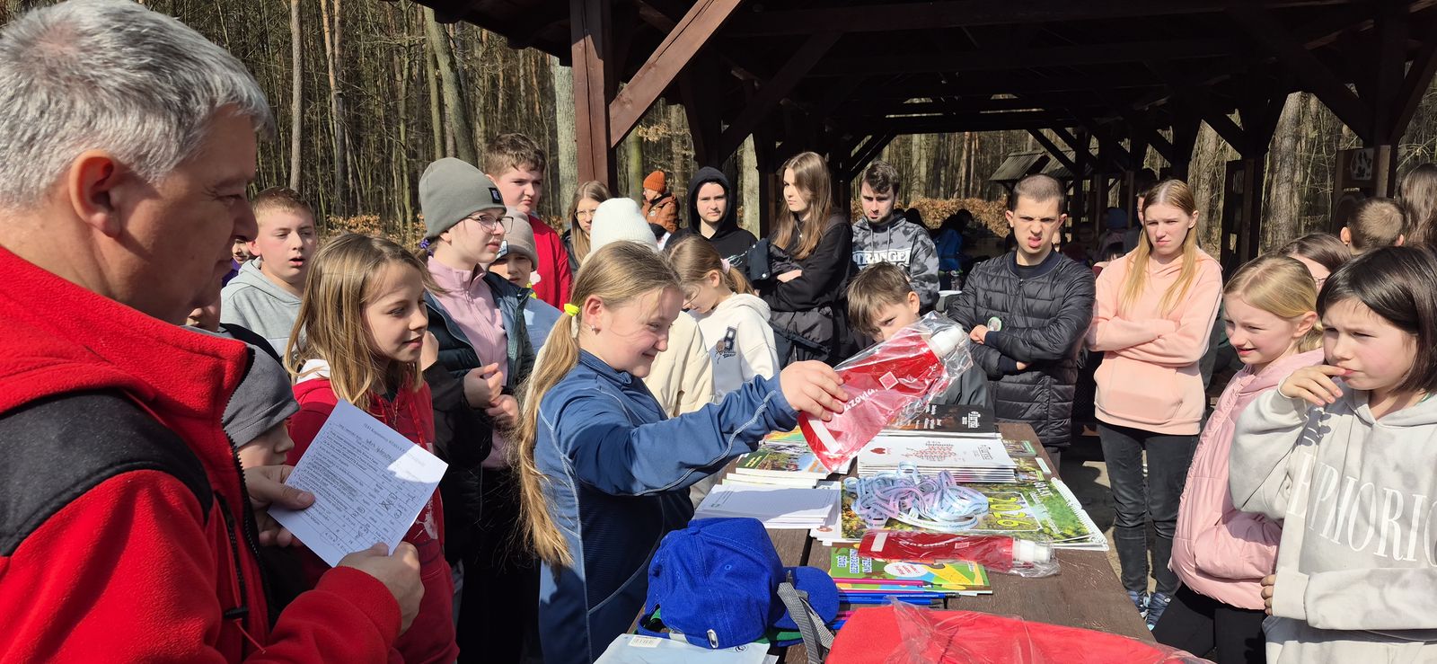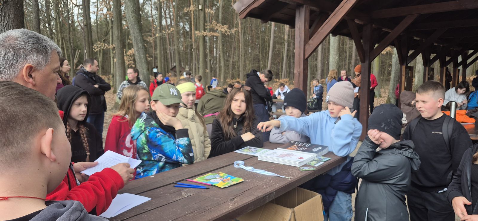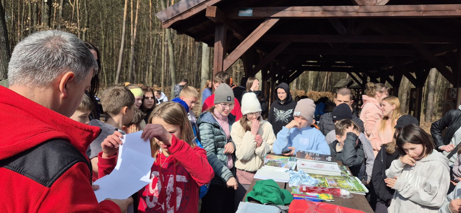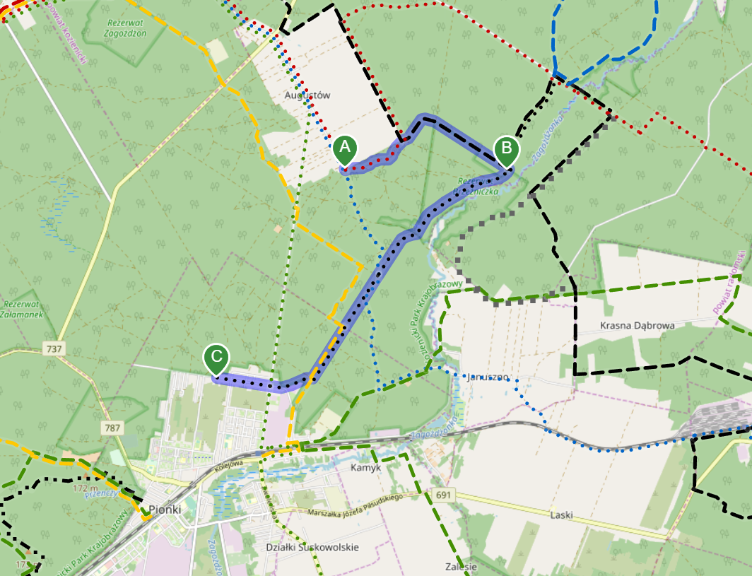 Wyruszyliśmy na trasę z Augustowa. Po przejściu kilkuset metrów dotarliśmy do urokliwej doliny Brzeźniczki. Woda na zbiorniku jeszcze nie rozmarzła - czeka na wiosnę:). Następnie, trochę na przełaj, przeszliśmy do leśnej mogiły z czasów I wojny światowej. Dalej, klucząc leśnymi duktami, dotarliśmy do rezerwatu Brzeźniczka. Tu o jego walorach opowiedział pani Karolina Bukowska z Nadleśnictwa Kozienice. Później, idąc tzw. Czarną Drogą, doszliśmy do Pionek i siedziby Nadleśnictwa Kozienice. Tam czekał na wszystkich gorący posiłek i oczywiście test krajoznawczy z nagrodami.
